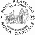 | Vignetta | riproduce un acquerello che raffigura una veduta dei Fori Imperiali, delimitata da una cornice lineare a rappresentare i colori della bandiera italiana. Completano il francobollo la leggenda "ROMA CAPITALE", la scritta "ITALIA" ed il valore "€ 0,60". |
