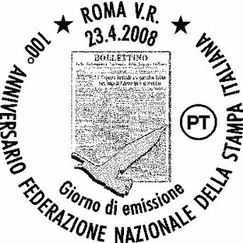 | Vignetta | Il francobollo riproduce il Bollettino n.1 della Federazione Nazionale della Stampa Italiana, che riporta un articolo dedicato al 1º Convegno Nazionale dei giornalisti italiani, svoltosi a Palermo nel 1946; in basso a sinistra, è raffigurato il profilo stilizzato di un gabbiano in volo. Completano il francobollo la leggenda "100º ANNIVERSARIO FEDERAZIONE NAZIONALE DELLA STAMPA ITALIANA", la scritta "ITALIA" ed il valore "€ 0,60". |