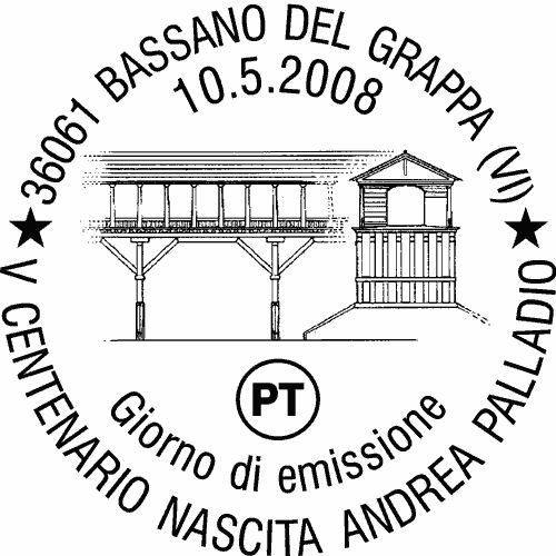 | Vignetta | Il francobollo raffigura il progetto del Ponte di Bassano detto 'degli Alpini', visto in prospettiva laterale e frontale. Completano il francobollo le leggende "ANDREA DI PIETRO DELLA GONDOLA", "IL PALLADIO 1508 - 1580" e PROGETTO DEL PONTE DI BASSANO DETTO "DEGLI ALPINI", la scritta "ITALIA" ed il valore "€ 0,60". |
