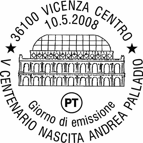 | Vignetta | Il francobollo raffigura il disegno della facciata principale della Basilica Palladiana di Vicenza. Completano il francobollo le leggende "ANDREA DI PIETRO DELLA GONDOLA", "IL PALLADIO 1508 - 1580" e "BASILICA PALLADIANA - VICENZA, la scritta "ITALIA" ed il valore "€ 0,65". |