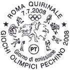 | Vignetta | raffigura un disco delimitato a sinistra da una cornice greca e a destra da una cornice floreale; in corrispondenza sono rappresentati, nella parte sinistra, alcuni atleti che ricordano le figure disegnate sulle ceramiche greche mentre nella parte destra, alcune figure di atleti orientali. Al centro del disco sono riprodotti i cinque cerchi olimpici. Completano il francobollo la leggenda "GIOCHI OLIMPICI-PECHINO 2008", la scritta "ITALIA" e il valore "€ 0,85". |
