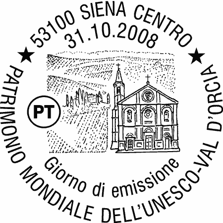 | Vignetta | raffigura un caratteristico paesaggio della Val d'Orcia e la facciata del Duomo di Pienza. Completano il francobollo le leggende "VAL D'ORCIA" e "PATRIMONIO MONDIALE", la scritta "ITALIA" e il valore "€ 0,60". |