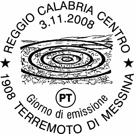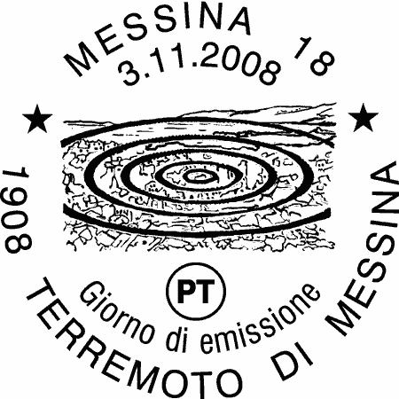 | Vignetta | raffigura, in grafica stilizzata, una veduta dall'alto della città di Messina con l'omonimo Stretto e, sullo sfondo, la città di Reggio Calabria; sulla vignetta si evidenziano alcuni cerchi concentrici a rappresentare le onde sismiche causate dal terremoto. Completano il francobollo la leggenda "1908 TERREMOTO DI MESSINA", la scritta "ITALIA" e il valore "€ 0,60". |