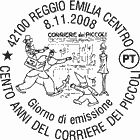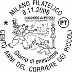 | Vignetta | raffigura la copertina del primo numero del Corriere dei Piccoli, edito il 27 dicembre 1908 e alcuni personaggi dei fumetti: Sor Pampurio di Carlo Bisi, Il Signor Bonaventura di Sergio Tofano, Marmittone di Bruno Angoletta e Valentina Mela Verde di Grazia Nidasio. Completano il francobollo la leggenda "100 ANNI DEL CORRIERE DEI PICCOLI", la scritta "ITALIA" e il valore "€ 0,60" |
