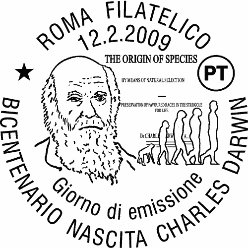 | Vignetta | raffigura, in primo piano, un ritratto dello scienziato Charles Darwin, sullo sfondo un particolare del frontespizio dell'opera ON THE ORIGIN OF SPECIES (L'origine delle Specie), prima edizione del 1859 e, in basso a destra, alcune sagome che rappresentano l'evoluzione dell'uomo, dai primi ominidi all'homo sapiens. Completano il francobollo la leggenda "CHARLES DARWIN 1809 - 1882", la scritta "ITALIA" ed il valore "€ 0,65" |