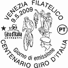| Vignetta | raffigura due ciclisti in abbigliamento dei primi del Novecento durante una gara e, sulla destra, alcuni spettatori che seguono la corsa; in alto, a sinistra, è riprodotto il logo del centenario del Giro d'Italia. Completano il francobollo la scritta "ITALIA" ed il valore "€ 0,60" |