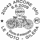 | Vignetta | raffigura la Gilera VT 317, modello 'ricostruito' della prima moto realizzata dall'azienda italiana, esposto nel Museo Piaggio "Giovanni Alberto Agnelli" di Pontedera; in alto è riprodotto il logo del centenario della Gilera e ai lati, sinistro e destro, sono rappresentate due bande a scacchi che idealmente ricordano la caratteristica bandiera che segnala la fine della corsa. Completano il francobollo la leggenda "LE MOTO", le date "1909-2009", la scritta "ITALIA" e il valore "€ 0,60" |