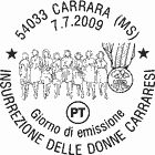 | Vignetta | raffigura, in grafica stilizzata, un gruppo di donne che sfilano in corteo e, in alto a destra, è riprodotta la medaglia d'oro al merito civile conferita alla città di Carrara nel 2007. Completano il francobollo la leggenda "INSURREZIONE DONNE CARRARESI", le date "7 LUGLIO 1944 - 7 LUGLIO 2009", la scritta "ITALIA" e il valore "€ 1,50". |