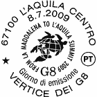 | Vignetta | riproduce, su fondo bianco, il logo del Vertice dei G8 che si svolge in Italia, nella città de L'Aquila, dall'8 al 10 luglio 2009. Completano il francobollo la scritta "ITALIA" e il valore "€ 0,60". |