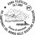 | Vignetta | raffigura un nuotatore nel corso di una gara di stile libero, uno dei quattro stili ufficiali del nuoto agonistico; in basso a destra è riprodotto il logo dei Campionati del mondo delle discipline acquatiche. Completano il francobollo la leggenda "XIII CAMPIONATI DEL MONDO DELLE DISCIPLINE ACQUATICHE", la scritta "ITALIA" e il valore "€ 1,50". |