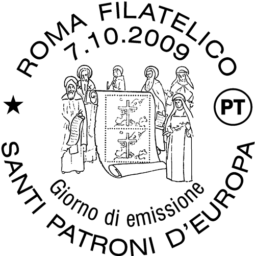 Celebra e al tempo stesso esalta le radici cristiane nella formazione dell'identità culturale europea. Emesso in occasione della mostra dedicata ai Santi patroni d'Europa e volta al tempo stesso a sottolineare la forza e la profondità delle ardici cristiane di un'Europa intesa come Giovanni Paolo II la intendeva, costituita dai "due polmoni" dell'Est e dell'Ovest ed in cui il mondo ortodosso e slavo ha anch'esso un'importanza primaria, il foglietto è firmato da Anna Maria Moresca, la grafica attiva da tempo al Centro filatelico del Poligrafico e Zecca dello Stato. Accanto a due francobolli con la croce, simbolo della cristianità, e sullo sfondo il profilo dell'Europa, l'artista del Poligrafico ha collocato le immagini dei Santi patroni d'Europa. Vale a dire Cirillo e Metodio, Brigida di Svezia, S. Benedetto da Norcia, Caterina da Siena e Teresa benedetta della Croce.