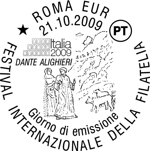 | Vignetta | riproduce una miniatura tratta dal codice Urbinate Latino 365 del secolo XV, conservato nella Biblioteca Apostolica Vaticana, raffigurante Dante e Virgilio davanti alle tre fiere: la Lonza, il Leone e la Lupa. Completano il francobollo la scritta "ITALIA" e il valore "€ 0,60". |