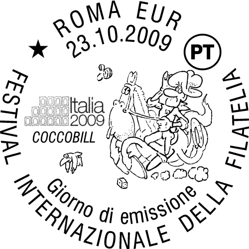 | Vignetta | il francobollo dedicato a Cocco Bill di Jacovitti rappresenta il personaggio in sella al suo fedele cavallo bianco, affiancati da un'ape e da un uccello in volo, elementi figurativi del fumetto. Sul francobollo è riprodotto il logo della manifestazione "Italia 2009". Completano il francobollo le leggende "FESTIVAL INTERNAZIONALE DELLA FILATELIA", "GIORNATA DEL COLLEZIONISMO I FUMETTI ITALIANI", la scritta "ITALIA", il valore "€ 1,00" e il rispettivo marchio distintivo del fumetto: "COCCOBILL". |