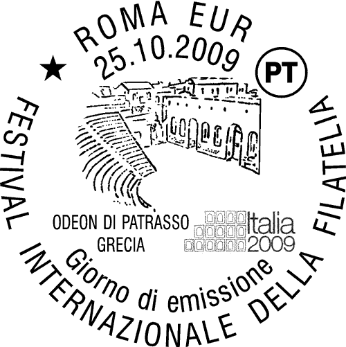 | Vignetta | Odeon di Patrasso, monumento realizzato tra il primo e il secondo secolo d.C. Sul francobollo, in basso a destra, è riprodotto il logo della manifestazione "Italia 2009". Completano il francobollo le leggende "FESTIVAL INTERNAZIONALE DELLA FILATELIA" e "GIORNATA DELL'EUROPA", la scritta "ITALIA", il valore "€ 0,65" e il nome della rispettiva opera: "ODEON DI PATRASSO - GRECIA". |