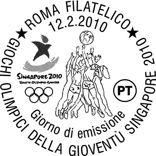 | Vignetta | il francobollo dedicato ai Giochi Olimpici della Gioventù "Singapore 2010" raffigura giovani atleti con le braccia protese verso l'alto in un'ideale azione di gioco finalizzata alla conquista di un pallone che rappresenta simbolicamente la superficie terrestre; in alto al centro è riprodotto il logo della manifestazione con i cinque cerchi olimpici Completano il francobollo la leggenda "GIOCHI OLIMPICI DELLA GIOVENTÙ "SINGAPORE 2010"", la scritta "ITALIA" e il valore "€ 0,85". |