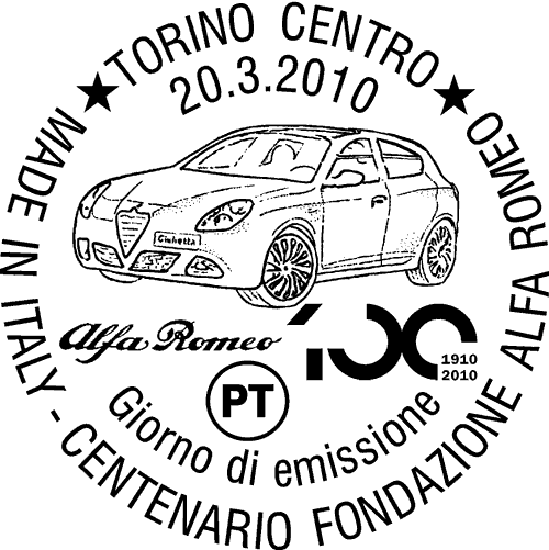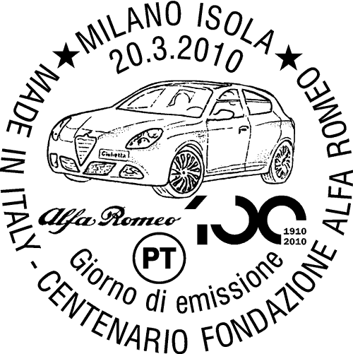 riproduce, in un ideale viaggio tra passato e futuro, il nuovo modello Giulietta che si ispira all'auto prodotta negli anni Cinquanta; inoltre è riprodotto il logo del centenario dell'Alfa Romeo. Completano il francobollo le leggende "MADE IN ITALY", "ALFA ROMEO", la scritta "ITALIA" e il valore "€ 0,60"