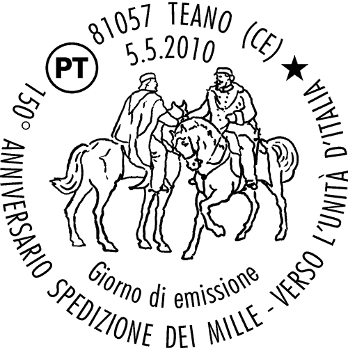 | Vignetta | riproduce opere pittoriche che raccontano le tappe più significative della "Spedizione dei Mille": l'incontro di Teano tra Giuseppe Garibaldi e Vittorio Emanuele II", opera di Pietro Aldi custodita presso il Palazzo Pubblico di Siena. Completano il francobollo le rispettive leggende "INCONTRO DI TEANO", la scritta "ITALIA" e il relativo valore "€ 1,00". |