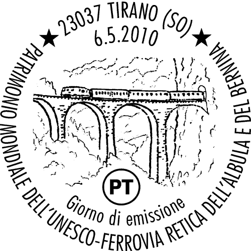 | Vignetta | raffigura un tratto della Ferrovia retica con il caratteristico 'Trenino rosso', che collega Tirano a Thusis passando per St. Moritz e attraversando le Alpi svizzere con numerosi trafori e gallerie, ponti e viadotti. Completano il francobollo le leggende "FERROVIA RETICA DELL'ALBULA E DEL BERNINA" e "PATRIMONIO MONDIALE", la scritta "ITALIA" e il valore "0,65". |