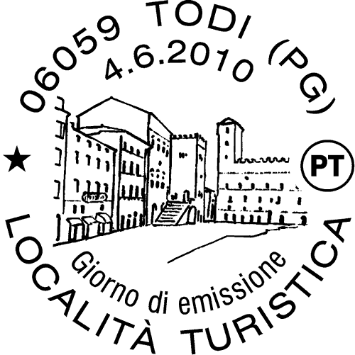 | Vignetta | Raffigura, entro una cornice lineare, una veduta pittorica e precisamente: Todi, una veduta di piazza del Popolo e il Palazzo dei Priori. Completano il francobollo le rispettive leggende "TODI", la scritta "ITALIA" e il valore "€ 0,60". |