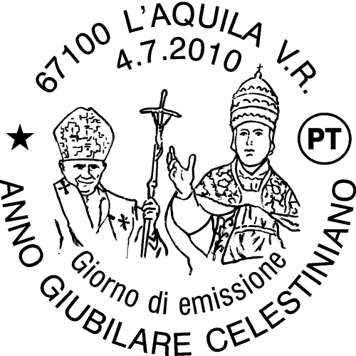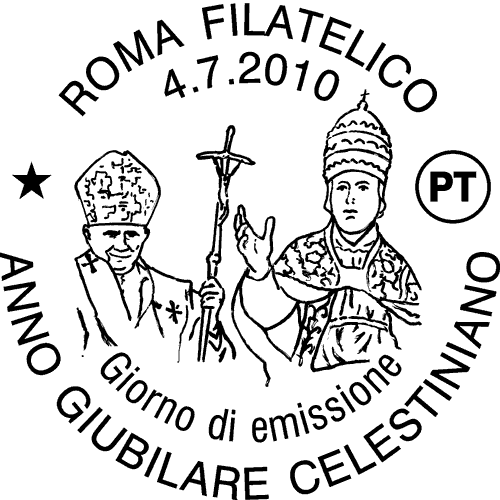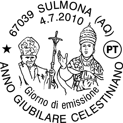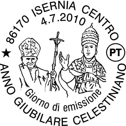 | Vignetta | su un fondino raffigurante un particolare del portale della Cattedrale di San Panfilo di Sulmona spicca, a destra, una statua che riproduce l'effigie di Celestino V conservata nella chiesa di San Pietro Celestino ad Isernia, affiancata ad un ritratto di Papa Benedetto XVI. Completano il francobollo la leggenda "ANNO GIUBILARE CELESTINIANO", la scritta "ITALIA" e il valore "€ 0,60". |