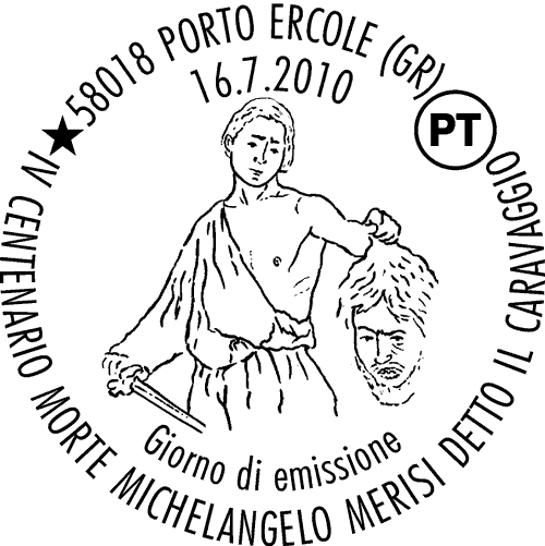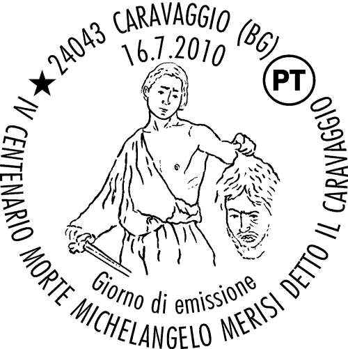 | Vignetta | riproduce il dipinto ad olio su tela "Davide con la testa di Golia" realizzato dal Caravaggio tra il 1609 e il 1610 ed esposto nella Galleria Borghese di Roma. Completano il francobollo le leggende "DAVIDE CON LA TESTA DI GOLIA" e "CARAVAGGIO", le date "1571 - 1610", la scritta "ITALIA" e il valore "€ 0,60". |