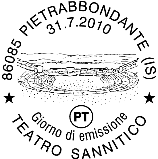 | Vignetta | raffigura una veduta del Teatro Sannitico di Pietrabbondante, edificato tra la fine del II secolo e l'inizio del I secolo a.C. e considerato uno dei principali complessi archeologici italiani dell'area centro-meridionale. Completano il francobollo la leggenda "TEATRO SANNITICO - PIETRABBONDANTE", la scritta "ITALIA" e il valore "€ 0,60". |