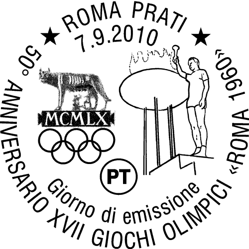 | Vignetta | riproduce, in basso a sinistra, il logo dei XVII Giochi Olimpici, caratterizzato dalla raffigurazione della lupa capitolina che allatta Romolo e Remo, i cerchi olimpici e un cartiglio che riporta in numeri romani 'MCMLX', anno di svolgimento dei Giochi e, a destra, un tedoforo ritratto accanto al tripode con la fiamma olimpica. Completano il francobollo la leggenda "50º ANNIVERSARIO XVII GIOCHI OLIMPICI ROMA 1960", la scritta "ITALIA" e il valore "€ 0,60". |