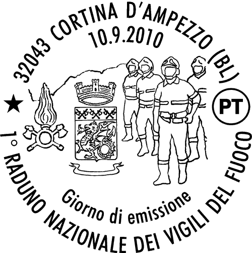 | Vignetta | raffigura Vigili del Fuoco ritratti nella loro divisa ufficiale e, sullo sfondo, il profilo stilizzato delle Dolomiti che circondano Cortina d'Ampezzo, località che ospiterà l'evento. Completano il francobollo il logo della manifestazione caratterizzato dalla scritta "VIGILI DEL FUOCO 1º RADUNO NAZIONALE - CORTINA D'AMPEZZO", lo Stemma Araldico ed il Fregio simbolo del Corpo Nazionale dei Vigili del Fuoco, la scritta "ITALIA" e il valore "€ 0,60". |