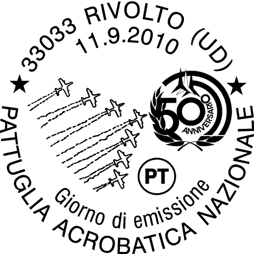 | Vignetta | raffigura, in basso a sinistra, un lembo della bandiera italiana da cui, idealmente, sfreccia la squadriglia della Pattuglia Acrobatica Nazionale, nella caratteristica formazione a cuneo; a destra, è riprodotto il logo del 50º Anniversario della fondazione della Pattuglia Acrobatica Nazionale. Completano il francobollo le leggende "AERONAUTICA MILITARE" e "PATTUGLIA ACROBATICA NAZIONALE", la scritta "ITALIA" e il valore "€ 0,60" |