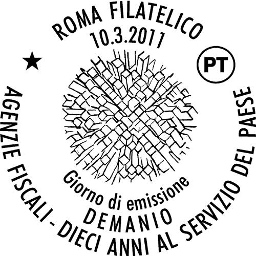 | Vignetta | riproduce il logo della rispettiva agenzia fiscale, il cui motivo è ripetuto in grafica stilizzata nei fondini di ogni vignetta. Completano il francobollo le rispettive leggende "DEMANIO", l'indicazione "DECENNALE DELLE AGENZIE FISCALI", la scritta "ITALIA" e il valore "€ 0,60". |