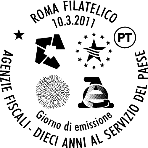 | Vignetta | i quattro francobolli, disposti su due file, sono inseriti in un riquadro perforato posto al centro del foglietto delimitato in basso, a sinistra e a destra da una fascia tricolore; in alto e in basso sono riprodotti rispettivamente lo stemma della Repubblica Italiana e il logo di Poste Italiane. Completa il foglietto la scritta "AGENZIE FISCALI DIECI ANNI AL SERVIZIO DEL PAESE". |