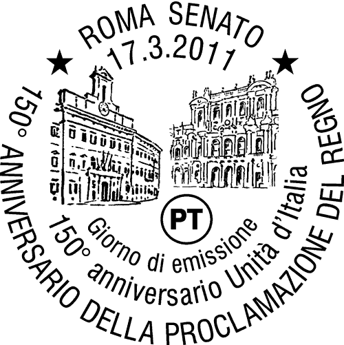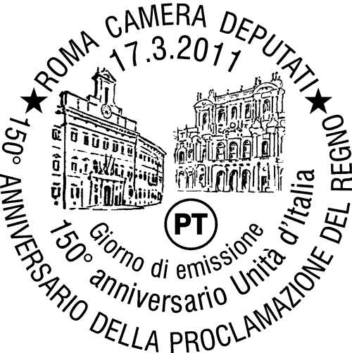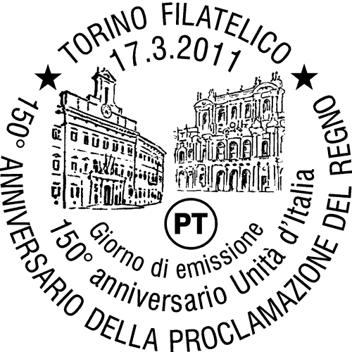 | Vignetta | raffigura, rispettivamente a sinistra e a destra, le facciate di Palazzo Montecitorio di Roma, realizzato nel XVII secolo da Gian Lorenzo Bernini, attuale sede del Parlamento italiano e di Palazzo Carignano di Torino, opera del XVII secolo di Guarino Guarini e sede del primo Parlamento italiano. Completano il francobollo la leggenda "150º PROCLAMAZIONE DEL REGNO D'ITALIA", la scritta "ITALIA" e il valore "€ 0,60". |