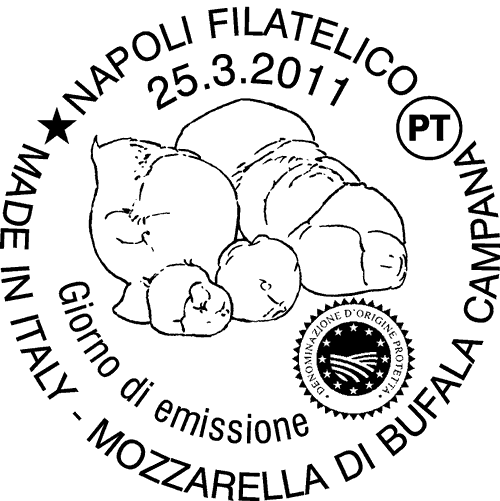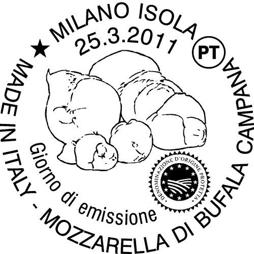raffigura un'immagine del prodotto gastronomico caseario a cui è dedicato il francobollo: Ragusano sia nelle forme intere che a spicchi e a fette. In basso a destra è riprodotto il marchio dei prodotti DOP (Denominazione di origine protetta). Completano il francobollo la leggenda "MOZZARELLA DI BUFALA CAMPANA", la scritta "ITALIA" e il valore "€ 0,60".