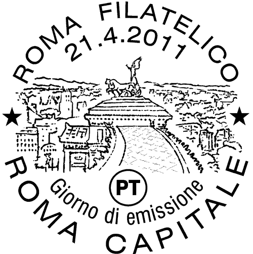 | Vignetta | riproduce, entro una cornice lineare con i colori della bandiera italiana, l'opera denominata 'Roma dalle Quadrighe del Vittoriano: dal Quirinale al Colosseo', realizzata da Marcella Morlacchi nel 2008 (collezione privata). Completano il francobollo la leggenda "ROMA CAPITALE", la scritta "ITALIA" e il valore "€ 0,60". |