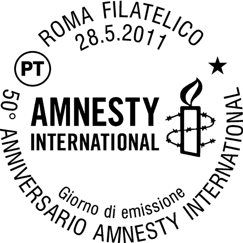 | Vignetta | riproduce in alto il logo di Amnesty International, mentre al centro campeggia la scritta "50 ANNI PER I DIRITTI UMANI"; sul fondino sono ripetute a tappeto una serie di parole che indicano gli obiettivi altamente umanitari perseguiti dall'Associazione. Completano il francobollo la scritta "ITALIA" e il valore " 0,60". |