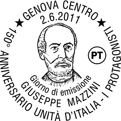 | Vignetta | Giuseppe Mazzini una foto d'epoca realizzata da Brogi nel 1870 raffigurante Giuseppe Mazzini, affiancato dalla prima pagina della rivista "La Giovine Italia" in evidenza sulla bandiera della stessa associazione politica (Biblioteca di Storia Moderna e Contemporanea di Roma), su cui campeggia la scritta "Unione, forza e liberta!!" (Museo del Risorgimento di Genova). Completano il francobollo le rispettive leggende "GIUSEPPE MAZZINI", la scritta "ITALIA" e il valore "€ 0,60". |