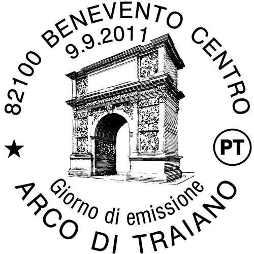 | Vignetta | raffigura l'Arco di Traiano, eretto in Benevento tra il 114 e il 117 d.C. per commemorare l'apertura della via Appia Traiana e dedicato all'imperatore Traiano. Completano il francobollo le leggende "ARCO DI TRAIANO" e "BENEVENTO", la scritta "ITALIA" e il valore " 0,60". |