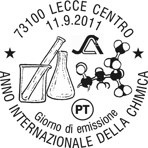 | Vignetta | raffigura una struttura molecolare e alcune ampolle di vetro utilizzate nei laboratori chimici; in alto a destra è riprodotto il logo della Società Chimica Italiana. Completano il francobollo la leggenda "ANNO INTERNAZIONALE DELLA CHIMICA", la scritta "ITALIA" e il valore "€ 1,40". |