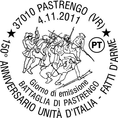 | Caratteristiche del Francobollo |  | Serie |  |  | Vignetta | Dedicato alle battaglie più rappresentative che hanno accompagnato il lungo processo di realizzazione dell'Unità d'Italia, dalla Prima Guerra d'Indipendenza alla Prima Guerra Mondiale. Riproduce per la Prima Guerra d'Indipendenza un particolare del dipinto "Battaglia di Pastrengo" (1848), Scuola del XIX secolo, Museo Nazionale del Risorgimento Italiano di Torino. Completano il francobollo le rispettive leggende "I GUERRA D'INDIPENDENZA BATTAGLIA DI PASTRENGO 1848", la scritta "ITALIA" e il valore " 0,60. |  | Valore | 0,60 € |  | Colore | sei |  | Dentellatura | 13×13½ |  | Tipo di dentellatura | Blocco |  | Stampa | Rotocalcografia |  | Stampato da | I.P.Z.S. Roma |  | Fogli da | Foglietti |  | Supporto | Carta fluorescente |  | Dimensioni | 40 × 30 (mm) |  | Disegnatore | G.Ieluzzo |  | Tiratura | 1000000 |  | Tag |  |  | Data di emissione | 11 / 2011 |  | Numero copie | Nuovo: 1