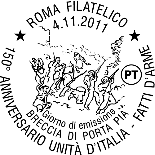 | Vignetta | Dedicato alle battaglie più rappresentative che hanno accompagnato il lungo processo di realizzazione dell'Unità d'Italia, dalla Prima Guerra d'Indipendenza alla Prima Guerra Mondiale. Riproduce per la Presa di Roma, un particolare del dipinto "Breccia di Porta Pia" (1870) di Carlo Ademollo, Civico Museo del Risorgimento di Milano. Completano il francobollo le rispettive leggende "PRESA DI ROMA BRECCIA DI PORTA PIA 1870", la scritta "ITALIA" e il valore " 0,60". |