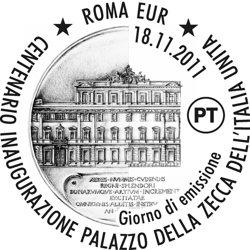 | Vignetta | raffigura il prospetto principale del Palazzo della Zecca con la riproduzione parziale, a sinistra, della medaglia di Attilio Motti del 1927, realizzata per i quindici anni di attività della "Nuova Zecca"; a destra il disegno prosegue la prospettiva oltre la medaglia; in basso a sinistra tre bande verticali con i colori del tricolore. Completano il francobollo la leggenda "PALAZZO DELLA ZECCA DELL'ITALIA UNITA", le date "1911 - 2011", la scritta "ITALIA" e il valore "€ 0,60". Elisa Rizzo della Scuola dell'Arte della Medaglia del Polo Artistico dell'Istituto Poligrafico e Zecca dello Stato S.p.A. |