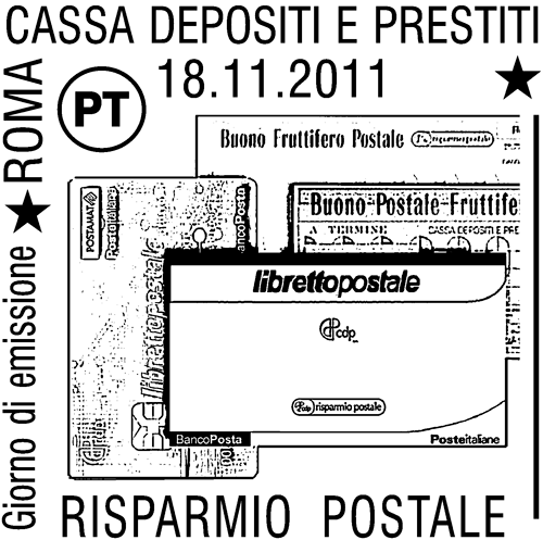 | Caratteristiche del Francobollo |  | Serie |  |  | Vignetta | sono riprodotti modelli più recenti e attualmente in uso di un libretto di risparmio postale, di due buoni postali fruttiferi e di una carta libretto postale. Completano ciascun francobollo la leggenda "RISPARMIO POSTALE", la scritta "ITALIA" e il valore € 0,75. |  | Valore | 0,75 € |  | Colore | cinque |  | Dentellatura | 11 |  | Tipo di dentellatura | Fustellatura |  | Stampa | Rotocalcografia |  | Stampato da | I.P.Z.S. Roma |  | Fogli da | 45 |  | Supporto | Autoadesivo |  | Dimensioni | 40 × 30 (mm) |  | Disegnatore | G.Ieluzzo |  | Tiratura | 405000 |  | Tag |  |  | Data di emissione | 11 / 2011 |  | Numero copie | Nuovo: 1