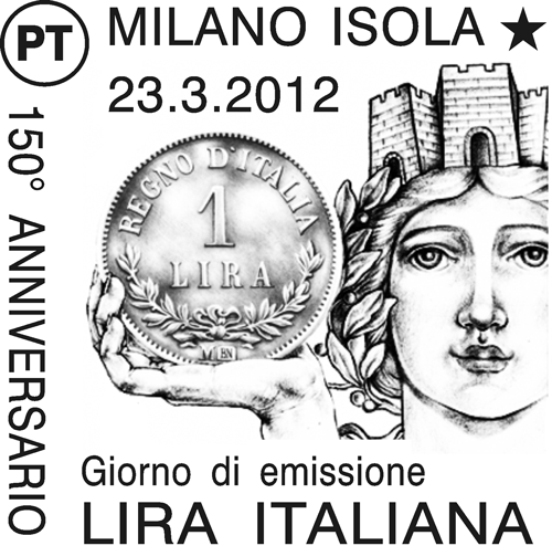 | Vignetta | Raffigura una moneta da una lira unità di conto del sistema monetale, emesse dopo la promulgazione della legge sull unificazione del sistema monetario del 24 agosto 1862 n. 788 e precisamente l'Italia turrita, ispirata ad un busto tratto da una medaglia di Pio Tailetti degli anni 30, che tiene in mano il rovescio della moneta da una lira d argento emessa da Vittorio Emanuele II nel 1863. Completano il francobollo la leggenda 150º ANNIVERSARIO DELL'UNIFICAZIONE DEL SISTEMA MONETARIO NAZIONALE, la scritta ITALIA e il valore € 0,60. |