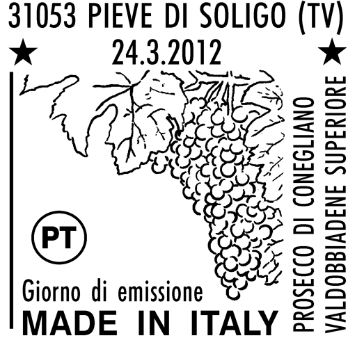 Raffigura un vigneto e un grappolo d'uva tipici dei vini DOCG a cui il francobollo è dedicato: Prosecco Conegliano Valdobbiadene superiore. Completano il francobollo le rispettive leggende "PROSECCO CONEGLIANO VALDOBBIADENE SUPERIORE DOCG", le scritte "ITALIA" e "MADE IN ITALY" e il valore " 0,60".