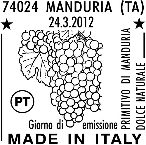 Raffigura un vigneto e un grappolo d'uva tipici dei vini DOCG a cui il francobollo è dedicato: Primitivo di Manduria dolce naturale. Completano il francobollo le rispettive leggende "PRIMITIVO DI MANDURIA DOLCE NATURALE DOCG", le scritte "ITALIA" e "MADE IN ITALY" e il valore " 0,60".