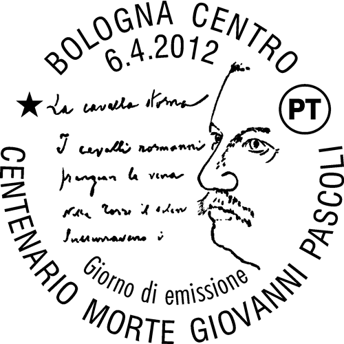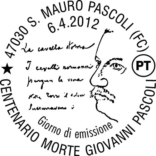 | Vignetta | raffigura, in primo piano a destra, un ritratto di Giovanni Pascoli sul quale si sovrappongono alcuni versi della poesia "La cavalla storna", tratti dalla bozza originale del poeta romagnolo. Completano il francobollo la leggenda "GIOVANNI PASCOLI 1855 - 1912", la scritta "ITALIA" e il valore "€ 0,60". |