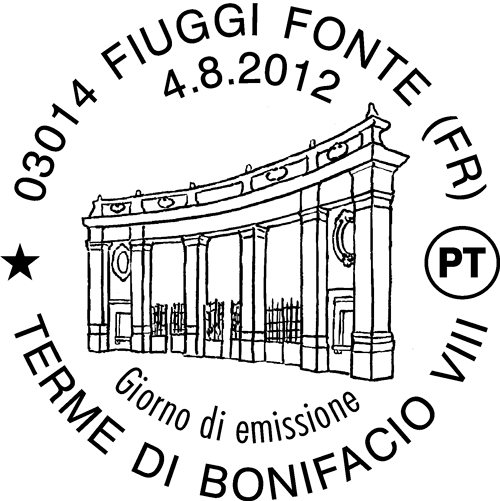 | Vignetta | raffigura il portale d'ingresso della Fonte Bonifacio VIII in Fiuggi, costruito all'inizio del Novecento in stile liberty per ospitare una delle più importanti stazioni termali d'Europa. Completano il francobollo le leggende "TERME DI BONIFACIO VIII" e "FIUGGI", la scritta "ITALIA" e il valore " 1,50". |