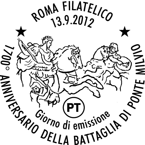 | Vignetta | riproduce un particolare dell'affresco eseguito da Giulio Romano tra il 1520 e il 1524 nella Sala di Costantino, uno degli ambienti delle Stanze di Raffaello nei Musei Vaticani. Completano il francobollo le leggende "GIULIO ROMANO", " LA BATTAGLIA DI PONTE MILVIO" E "SALA DI COSTANTINO - MUSEI VATICANI", la scritta "ITALIA" e il valore "€ 1,40". |