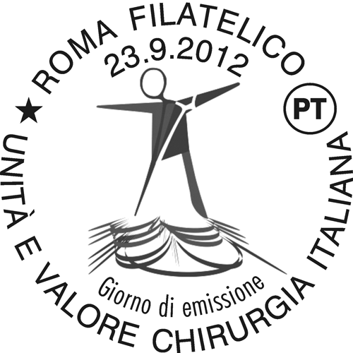 | Vignetta | raffigura, in grafica stilizzata su campo bianco, la figura di un uomo composta dai "ferri" utilizzati in chirurgia. Completano il francobollo le leggende "UNITÀ E VALORE CHIRURGIA ITALIANA" e "CONGRESSO CHIRURGHI ITALIANI", la data "ROMA 23-27 SETTEMBRE 2012", la scritta "ITALIA" e il valore "€ 0,60". |