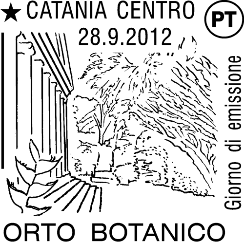 | Vignetta | sono realizzate con l'impostazione grafica della serie di riferimento e raffigurano scorci dei rispettivi orti botanici . Completano il francobollo la leggenda "ORTO BOTANICO DI CATANIA" la scritta "ITALIA" e il valore "€ 0,75". |
